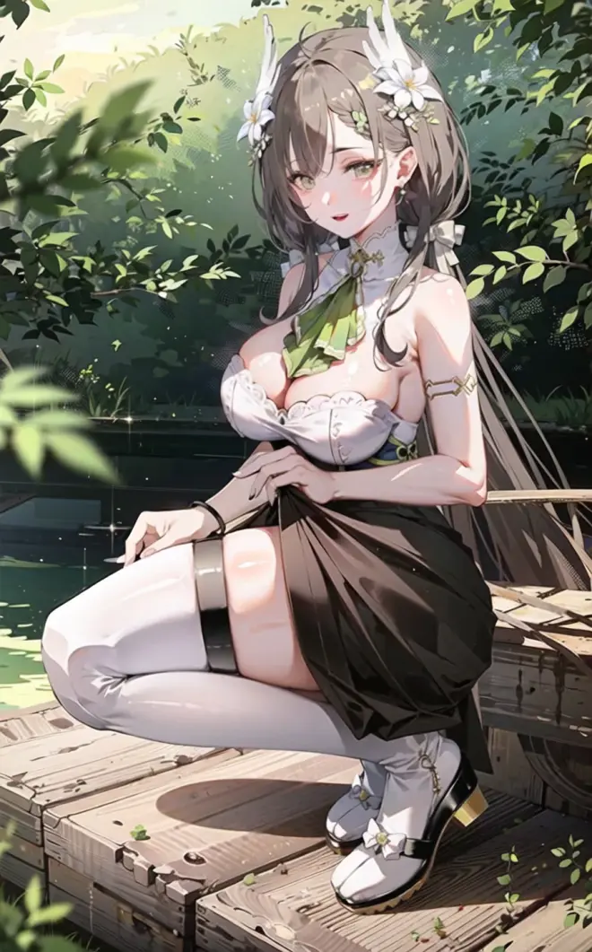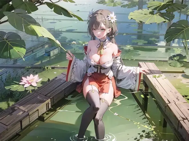 (((masterpiece))), (((best quality))), ((ultra-detailed)),(illustration), (detailed light),((an extremely delicate and beautiful)),dramatic_shadow,ray_tracing,(8k, best quality, masterpiece:1.2), 1girl,mature woman,(solo),huge breasts,grey hair,(pretty eyes),lake,(waterfall),green eyes,hanfu,chinese dress, opened_shirt,bare_shoulder, pretty legs, (((black_thigh_highs, skindentation))),full body, leggings,uwabaki, ((shiny_skin)),white_flower, hair_flower, hair_ornament, solo, long_hair, smiling at the viewer,Soft Lighting,best shadow,(red lotus),water red lily flower