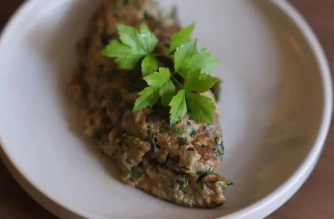 5、将野菜末和萝卜末放入盆中。倒入食盐。倒入豆面粉。将食材搅拌均匀。团成野菜团子,蒸15分钟即可。