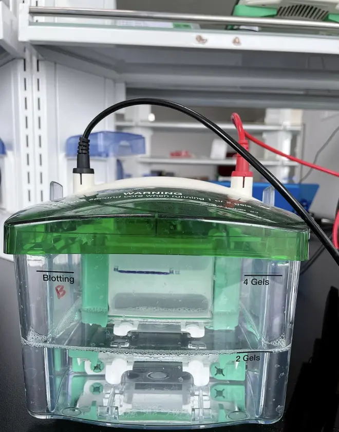 4.转膜: 1)将多余的胶切去 2)安装转膜装置:取出转膜板,黑板朝下,依次放入海绵,滤纸,胶,NC膜(注:NC膜要提前放入甲醇活化),滤纸,海绵,要将胶与膜之间的气泡除尽,夹紧转膜夹,置于转膜槽中,倒满转膜液(转膜夹放置时主义方向,黑对黑) 3)转膜:将转膜槽与Power连接,设置条件为电压100V,1h,置于倒了冰水放了冰袋的泡沫盒里转膜。 5.封闭:用5%脱脂奶粉封闭,用PBS配制5%脱脂奶粉,将NC膜取出来,根据要跑的蛋白先切膜,放入配制好的牛奶中,摇床上封闭1h。 6.敷一抗:按照说明书稀释一抗,在抗体盒上做好蛋白标记,倒掉封闭液后,条带先用PBS洗1-2次,然后敷一抗(一个孔道5ml),抗体盒放在4℃摇床过夜。 Western Blot实验步骤-第二天 1.把抗体盒先拿出来静置10min,配制TBST,我们实验室是将10✖️的稀释成1✖️的 2.二抗1:10000稀释 3.洗条带:用TBST洗 7min洗5次或10min洗3次 速率70