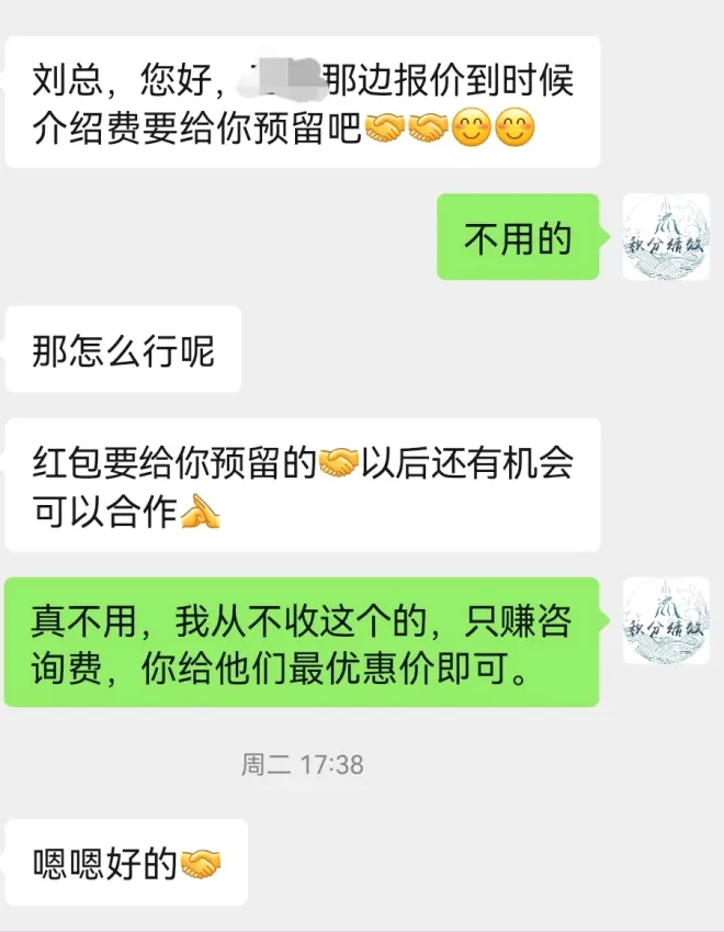 守住底线:不赚客户咨询费以外的钱 。 服务客户的过程中,客户会有一些设备、软件、人员方面的需求,因为信任,会请我们介绍,按商业潜规则,第三方会给介绍费,但我们从未收过,理由如下: 1.客户已支付我们咨询费,为客户提供服务是我们的本分; 2.第三方的介入,比如软件,对我们咨询项目的效果会有帮助; 3.如果想着收介绍费,心思会变,服务质量要打折扣,收小钱误主业; 4.如果收了介绍费,第三方服务不好,我们将陷于被动。 所以不是什么钱都要赚,竭尽全力把主业做好才是最重要的。