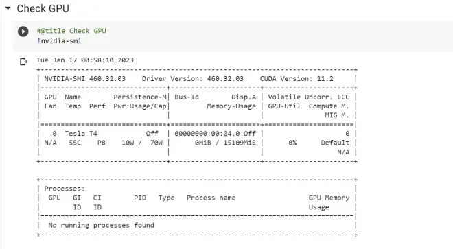 我们需要确定当前会话是在哪个 GPU 上运行。只需在“检查 GPU”部分下单击播放按钮即可。安装成功后,播放按钮上会出现一个绿色的小复选标记。