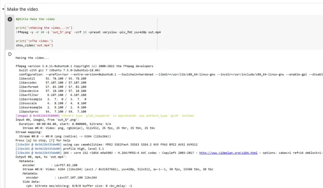 接下来,我们需要生成动画。笔记本会在生成视频文件时预览每一帧。最后,我们需要保存视频文件。生成的视频文件将是一个简单的四秒钟 MP4 格式的视频。