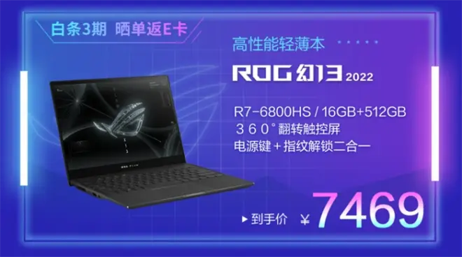 ROG幻13 2022采用轻薄机身设计,整机薄至15.8mm,轻约1.3kg;配备13.4英寸16:10 窄边框触控屏,120Hz高刷新率,500nit高亮度,支持100% sRGB高色域覆盖,全方位满足用户的游戏创作需求;屏幕支持360°随心翻转,为用户带来笔电、平板、分享和游戏四种使用模式;搭载AMD锐龙7 6800HS移动处理器,Zen3+架构打造,6nm制程工艺,8核心16线程,至高加速频率可达4.7GHz。