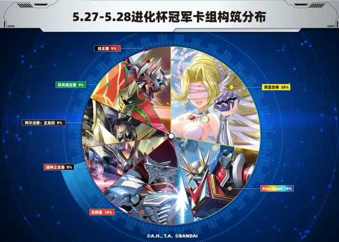 2023年5月27日至28日,《数码宝贝卡牌对战》简体中文版进化杯共计举办11场,388名驯兽师参与,共收集到22套有效构筑上位卡组,11套有效构筑冠军卡组。其中不包含未能及时反馈或无效的赛事信息。环境分布如下: