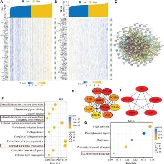 作者从TCGA中确定了表达共同性的基因。热图显示了与STAD中TPM4表达呈正相关和负相关的前50个共表达基因(图10A、B)。与TPM4表达呈正相关的前100个共表达基因显示在PPI网络中(图10C)。前10个中心基因是COL1A2、COL1A1、CLO3A1、COL5A、POSTN、FN1、MMP2、LUM、SPARC和DCN(图10D)。前5个中心基因是COL1A2、CLO3A1、FN1、MMP2、LUM、SPARC和DCN(图10E)。随后,作者使用前300个共表达基因进行了GO和KEGG富集分析。GO分析涉及分子功能、细胞组分和生物过程(见图10F)。KEGG通路富集分析(见图10G)。结果显示,TPM4表达通过调节细胞外基质在胃癌中发挥作用。