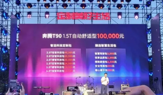 转自【车轱辘话】6月18日,奔腾T90以“起售价+配置升级包”的全新模式上市,新车推出1款基础车型,6款定制包。其起售价为10万元,6个定制包售价为13999元至46999元。