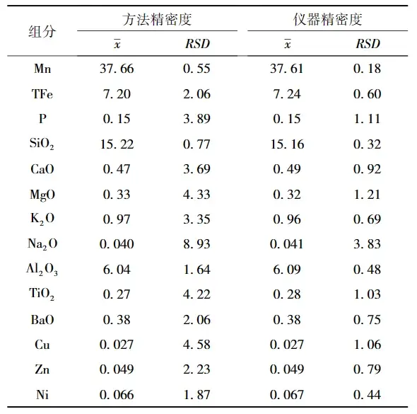 选一含量合适的锰矿,按上述实验步骤平行制备12个玻璃熔片,于荧光光谱仪中测试得方法的精密度;再选其中一个玻璃熔片重复测量12次,检验仪器精密度。