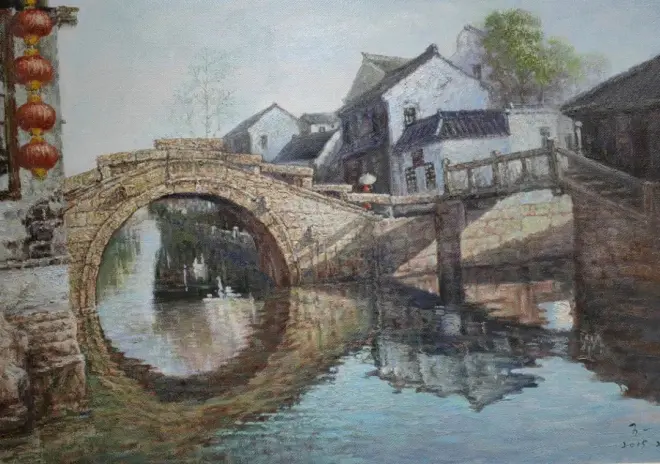 非常喜欢在王一画的江南水乡里游目骋怀。那一座圆圆的拱桥,不知承载了多少人的乡恋,只不过时光荏苒,让那些石板路成了回不去的梦境。幸亏有王一先生的精心创作,他让一支画笔充满温情的力量,为自己也为所有人在画布上展示可以看得见,可以触摸得到的温情水乡。看这些画儿可以安慰游子的心灵,看这些画儿可以遥想石巷里的那抹葱绿,可以追忆从石桥上走过的那个叫丁香的姑娘!