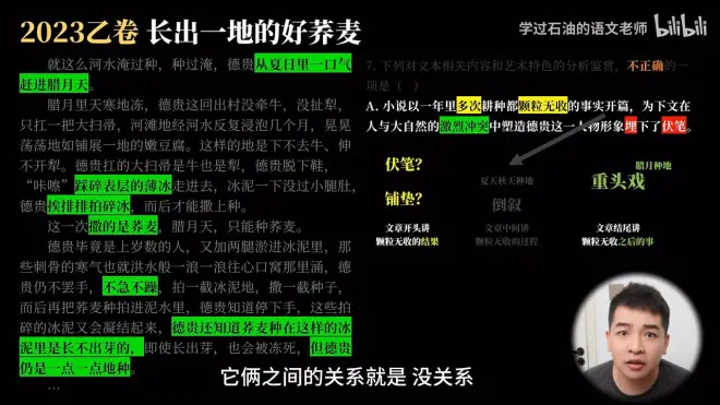 奇哥怒批:知道种在冰地里长不出来,靠做梦安慰自己荞麦长得好,高考就考这种文章?目的为何?套着歌颂农民、歌颂劳动的温情故事,鼓励学生也要这样不切实际地劳动,不顾自己身体?这老农他如果生病了,他有医保吗?老农为什么不去别的地方种地呢,为什么非要在这河水反复冲刷、一定长不出庄稼的地方种地呢?不解决这个问题,反而在这歌颂他。这农村的老头,种了一辈子地,老了老了,靠这锄地过瘾(2016年Ⅰ卷六安爷)。写这文章的人,真的是从农村长出来的吗?你写这文章,它贴合农民的心理吗?这是魔幻现实主义吧!你想想你,你靠刷题跟别人卷了十多年,然后呢你练习册掉水里了,在冬天结冰了,你把冰破开,也要冻着手指头写。你明知道现在已经毕业了,写也没有用了,也不需要写了,你说我图一乐,做梦梦见自己练习册还都自动地写满了。就这篇文章写的情节,我当了一辈子农民的爷爷如果读的话,他肯定会骂这作者的娘!