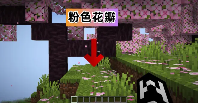 ②粉色花瓣:樱花树会不断飘落粉色花瓣粒子。而粉色花瓣就是飘落在地上的樱花花瓣,它是一个物品,可以被放置在地面上,一个方块可以放置4片花瓣。会在樱花树下自然的生成。PS:原先我还以为这是一种落花的粒子效果。