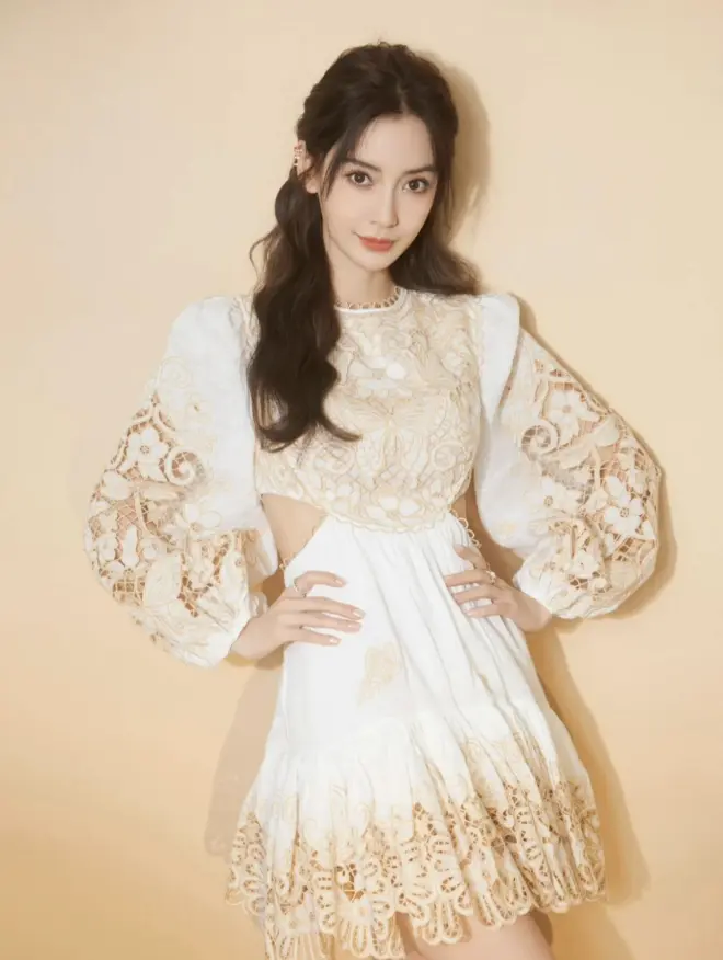 Angelababy杨颖的这件腰部镂空连衣裙也很细节,袖口处做了灯笼袖设计,胸前、衣袖和裙摆都是蝴蝶花朵的蕾丝设计,精致而又灵动,宛如森系少女。