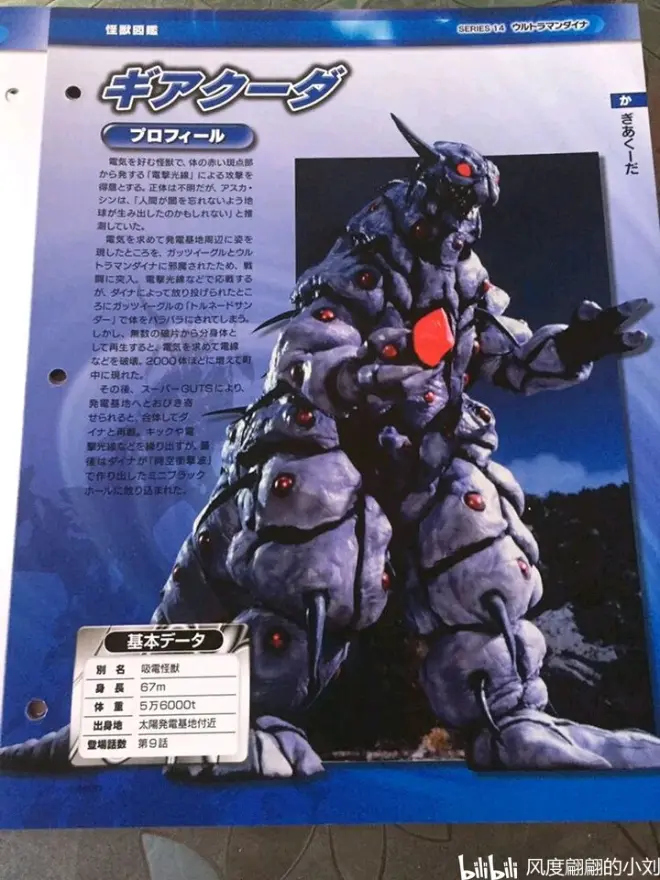 吸电怪兽基阿库达,喜好吞食电力的怪兽,在落雷打到太阳能发电基地附近的神秘遗迹时,从光芒中出现。得意技是从身上的赤红斑点中发射的红色电击光线。 基阿库达为了寻找电力能源而接近03地区的太阳能发电基地,因此受到SUPER GUTS(超级胜利队)的攻击。基阿库达以电击光线让胜利神鹰号受挫后,又和飞鸟信变身的戴拿奥特曼展开战斗,一度以电击光线和怪力先后对抗了戴拿的闪亮型和强壮型两大形态,后被戴拿扔上天空,再遭到胜利神鹰号的龙卷雷鸣炸成碎片。 然而事情并未结束,基阿库达的碎片流散至东京各地,通过再生能力分裂成二千只分身体,在城市各处吞食电力,使东京的电力系统受到重创。由于它的碎片能进行再生分身,因此不能再贸然攻击。超级胜利队想出新战略,利用发电基地的高能源电力引来基阿库达,使其为吸收更多电力而重新合为一体,再利用TPC陆战部队的燃烧炮将之彻底烧毁。 超级胜利队开始电力诱惑作战,吸引基阿库达的分身体前来,却因为突如其来的雷暴天气破坏了发电塔装置,在作战即将失败时,飞鸟信再次变身为戴拿奥特曼·奇迹型,以超能力修复发电塔,使基阿库达重新变为合成体。经过一番激战后,戴拿制伏了基阿库达,将基阿库达带到外太空中炸碎,并利用时空冲击波制造迷你黑洞将其碎片全部吸收,放逐到时空的尽头。 基阿库达的身份来历、以及喜欢吸食电力的动机都是不明。被飞鸟信推测为是“地球为了让人类不忘记黑暗的存在而找来的怪兽”。 高速怪兽丹克沙德尔