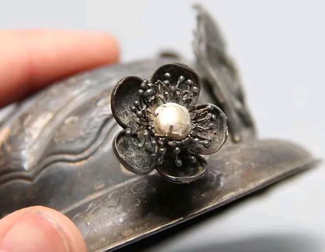 【描述】 海外回流 明代 银质花卉纹束发冠,一边发簪缺失珍珠,品相如图。