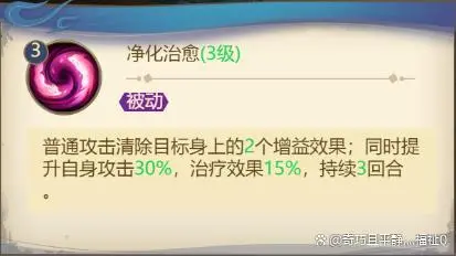 普攻可以清除目标的增益效果,同时提高自身的攻击力和治疗效果。这个技能进一步提升了天羽织的奶量,清敌方buff的效果也增加了她的功能性。