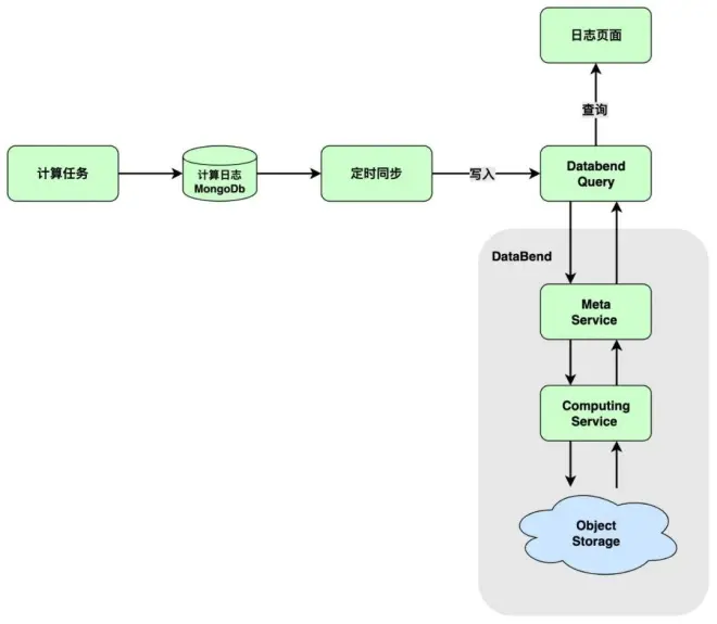 计算任务会将计算日志保存到 MongoDB;然后会通过定时任务,将日志从 MongoDB 同步到 Databend 供页面查询。