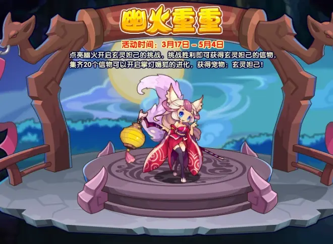 点亮幽火开启玄灵妲己的挑战,挑战胜利即可获得玄灵妲己的信物,集齐20个信物可以开启掌灯媚狐的进化,获得宠物:玄灵妲己!