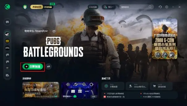 迅游加速 器支持对《PUBG》的免 费加速,在进行加速之前,玩家需要打开迅游加速器,在客 户端页面上方找到“口令兑换”按钮点击,输入(迅游会 员馈赠)即可将免 费会 员领取 ,激活后,搜索找到《PUBG》进入,点击“立即加速”即可完成对《PUBG》的免 费加速。