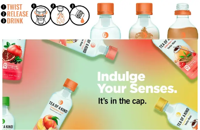 Gizmo推出的一款名为“Tea of A Drink”即饮冰茶系列,Tea of A Drinks富含丰富维生素C,并且零糖、零卡路里和零人工防腐剂。其重点特色在于Vessl系统,一种封闭的容器(即瓶盖),通过将新鲜食材原料储存在氮气压缩的贫氧室内,在饮用前仅需扭转瓶盖,活性成分可通过腔室排出,并立即与瓶中富含营养与风味的液体充分混合,即可享受一杯新鲜冲泡的定制茶饮。