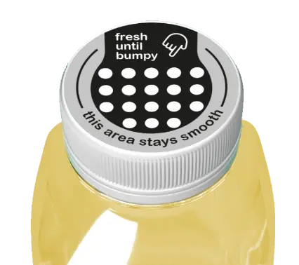 MIMICA TOUCHCAP通过凝胶专利技术将凝胶嵌入瓶盖中,该凝胶能够根据存储条件和食品特性使专业标签从光滑变得凹凸不平,使瓶盖成为新鲜度指标,并在第一次打开饮料时被激活。凝胶不与内容物有任何物理接触,仅利用时间和温度来准确预测饮料何时变质。Bump Cap 旨在帮助减少食品浪费。如果瓶盖顶部摸起来是光滑的,则说明里面的饮料仍然可以放心食用。与查看保质期的传统方式相比,这种提示食物是否可以安全食用的方式更加准确,能够大幅减少食品浪费。