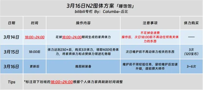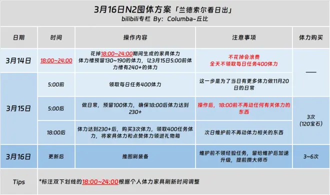 游戏的重置时间为每日5:00,利用N2/N3前1~2日价格更便宜的体力留到N2/N3使用以达到用更少的支出获取更多的收益。