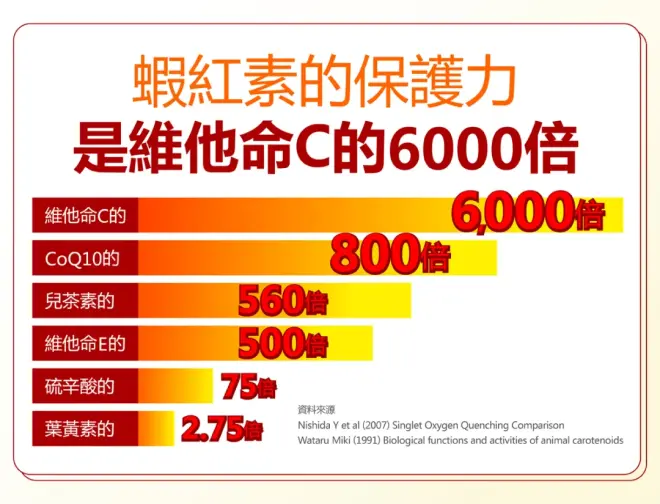虾青素的抗氧化能力是维生素E的550倍,是维生素C的6000倍,被誉为“超级维生素E”,是迄今为止,自然界中发现的抗氧化能力最强的物质。
