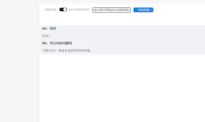 这个ChatGpt最新很火啊,无意间看到一个中文ChatGpt网站,我自己试了下还是非常不错的,速度很快,之前好像是不需要输入Key使用的,但是好像说是成本太高,现在需要输入自己的Key就可以使用了,输入Key后,就无需科学上网,还是非常不错的,Key怎么获取,可以到ChatGpt官网获取就可以了,好了,有兴趣的自己去看看吧。