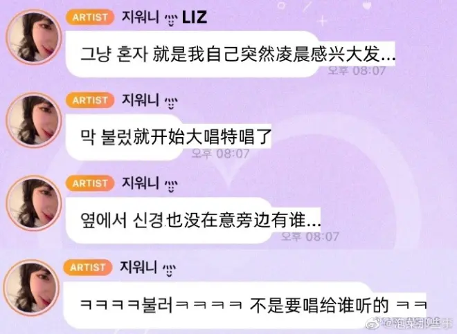 情况是这样的,李瑞在泡泡聊天的时候,直言今天有TMI,也就是大家必须要知道的一些信息,于是便婉转的说出了LIZ在酒店里唱歌的事情,而且还是在大晚上,忙内李瑞表示LIZ姐姐一直唱ballad曲给自己听,而且唱到很晚很晚,本来事情到这里不会引起甚至争议,甚至还会让人感到LIZ和李瑞的关系好。