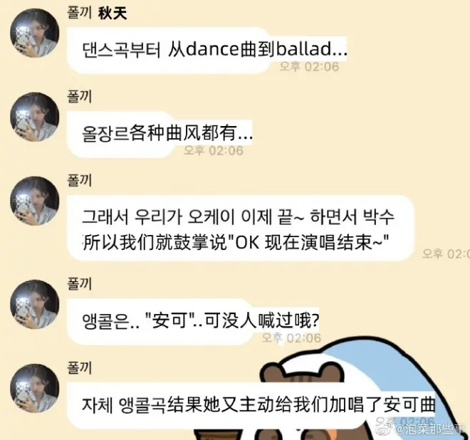 到了秋天发言,就稍微有点直接了,但也给LIZ留了面子,秋天表示LIZ在凌晨从dance曲到ballad曲,各种曲风都有,所以自己和李瑞就鼓掌提醒LIZ现在演唱结束了,不料LIZ自己说要“安可”,于是她自己又主动加唱了安可曲,说白了LIZ完全就是没有意识到她的行为影响了别人的休息。