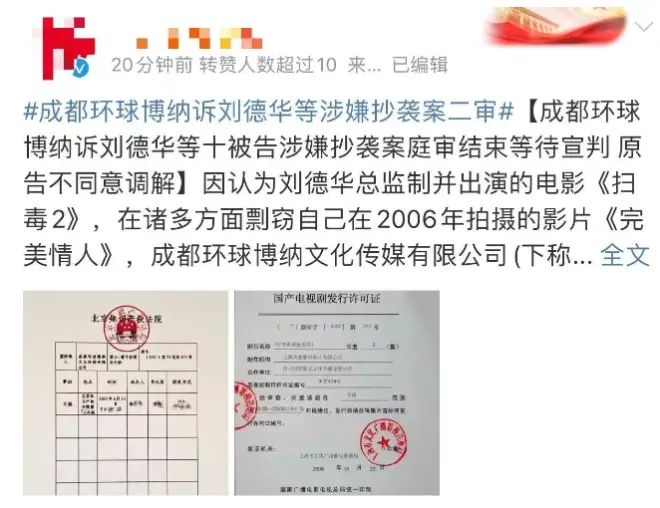 近日,刘德华被起诉一案有了最新进展。据报道,原告方不同意和解,要求索赔 9999.9999 万元。事情起源于两年前,当时四川导演阿生控诉由刘德华担任监制并主演的电影《扫毒 2:天地对决》抄袭了自己 2006 年拍摄的电影《完美情人》。随后,成都环球博纳文化传媒有限公司将刘德华及 3 名编剧等一共 10 个人,和《扫毒 2》出品方公司告上了法庭,并索赔 9999.9999 万元。
