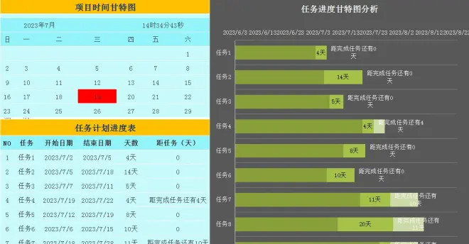 首先介绍日历和任务计划进度表,此表会自动生成一个当前期的日历,并用红色标注当天日期,再在进度表内录入任务,设置计划开始和结束时间,表格会自动计算出任务计划完成天数和剩余时间。
