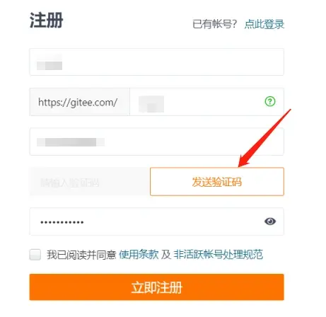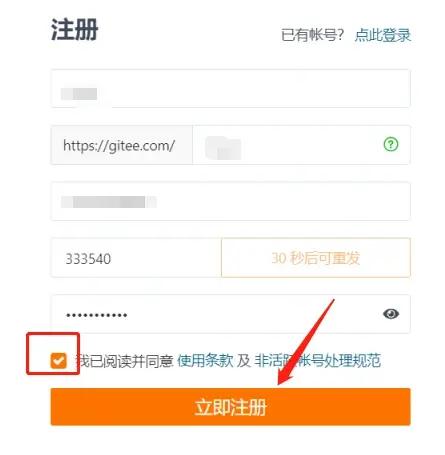 4)当手机揽收到验证码后,在“验证码”输入框中输入接收到的验证码,然后勾选协议,点击“立即注册”,至此Gitee账号注册成功。