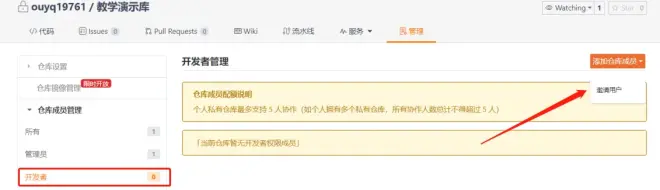 2)在“管理”页面的左侧点击“仓库成员管理”——“开发者”,在右侧上方点击“添加仓库成员”,在展开的菜单中点击“邀请用户”