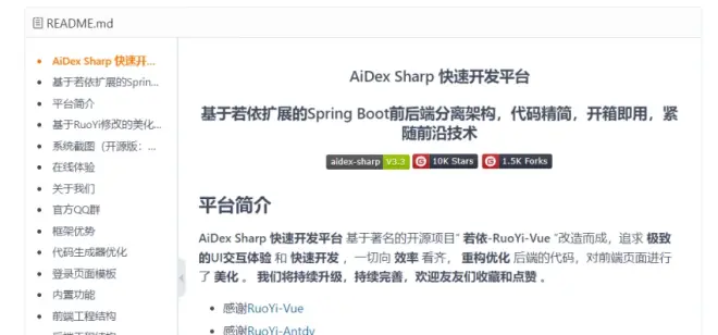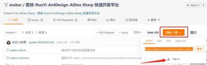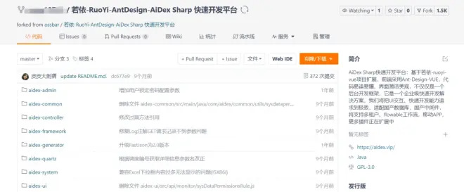 选择第一个开源项目:“若依-RuoYi-AntDesign-AiDex Sharp 快速开发平台”,点击进入
