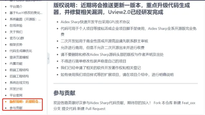 在自述文件左侧标签的最下方两条分别定义了“许可补充说明”和“贡献参与方式”