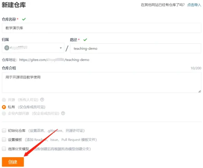 4、输入仓库的名称,路径会自动生成(如果修改,路径建议不要太长且只包含小字字母和“-”两种符号),然后输入仓库介绍,最后点击“创建”完成项目的创建