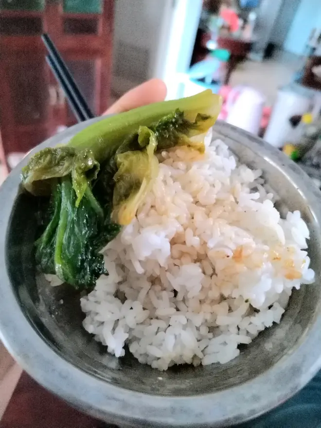 午餐炒半肥瘦(很好吃!油汁很香。),炒生菜(放了半肥瘦进去炒,有那种甜味,很好吃。),半块腐乳(腐乳吃完了),三碗饭(今天的饭很香很香)(光盘是谁我不说)