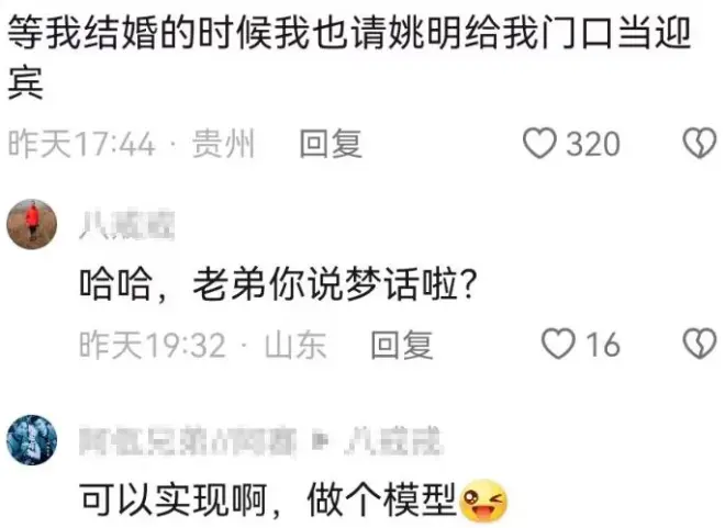 有网友调侃,等到他结婚,也要邀请姚明给我当迎宾,底下的人则回应,老弟,你又在说梦话啦!有人表示,这个愿望可以实现,做个模型放门口吧!