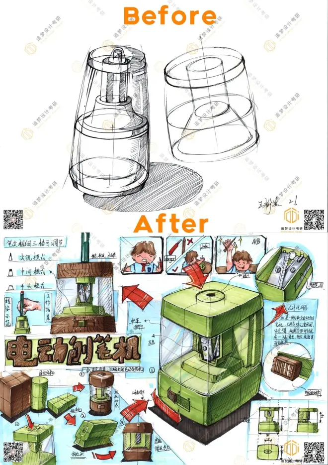 手绘和理论一样是一个慢慢累积的过程。手绘一方面注重设计思维、素材的积累,另一方面也不能忽视绘制能力的培养,一个优秀的快题手绘它既要有良好的表达效果,也要有产品的创意。