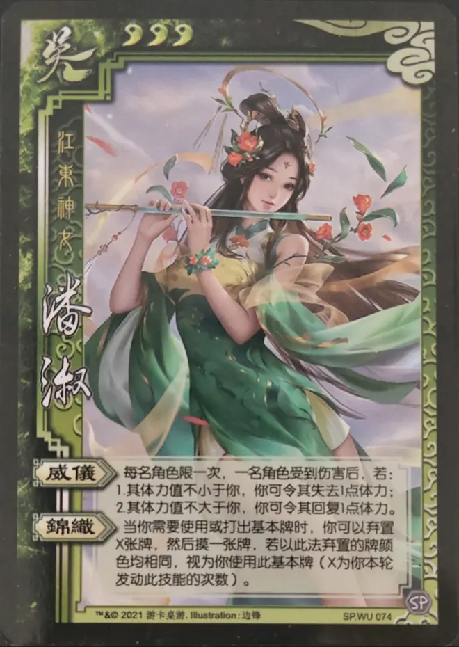 一技能对每人一次的限定技给自己有一次免费回血对队友也均有一次回血对敌人有一次血量压制但是想要回血需要潘淑自身血量健康想要压制对方需要潘淑自身残血这个度还是不好把控的,所以这也并非其主技能。二技能第一次白嫖一牌第二次制衡一牌第三次开始持平收益第四次往后越来越亏,总体来看开三次是不成问题的,并且一般仍二也能保证颜色相同这样还能白嫖三张基本牌其实还是有收益的,而且最离谱的是潘淑的恢复能力非常变态,即使被压制到一血自己回合可以0牌回满,回合外相当于保底一桃这些都是实战中非常恐怖的存在,所以潘淑的抗压能力非常强,每回合稳定的回复与优秀的长线对战能力使得其就是防守反击的最好代表,靠着恢复将你拖垮然后慢慢一刀一刀折磨你,但是遇到多刀和直伤将就会有点伤,毕竟在大过牌面前找乐还是很轻松的,因为只能转化基本牌所以其对锦囊是没有抗性的,直伤压到一血再贴乐下回合大概率就没了,所以队友和自己一定要存好无懈保证被压制残后可以进行恢复。