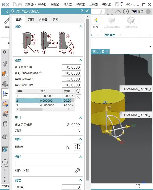 这个编号一呢它属于就是设置我们这个前面的先端直径的。但是你要注意这个是半径。那么前面我们看到了这个线段直径是2,那么它的半径就是一好,你设定为一就可以了。那么它先端这一部分,它就是两高米,然后再来设定我们这个R的角。这个R的角呢就是第二项,第二项拿了的呢我们是阿了几R了3。那么我们把这个R3设定上去,设定上去之后,那么上面它会自然的帮我们设定成8毫米..为什么?因为我们这两边是233,那么加上中间的2毫米直径,再加上旁边的3,那不就是8毫米嘛。所以呢这个非常简单,只要你把这两项设定好就可以了。设定好之后呢,那么注意这个地方还有一个跟踪点。这个跟踪点呢我们要把它设定好,那点开它。那这里面呢我们要注意它有两个,一个是我们前面上面这一段的,一个是最底下这一段的。那么我们上面这一段直径是多少?那上面这一端的直径它是8毫米。