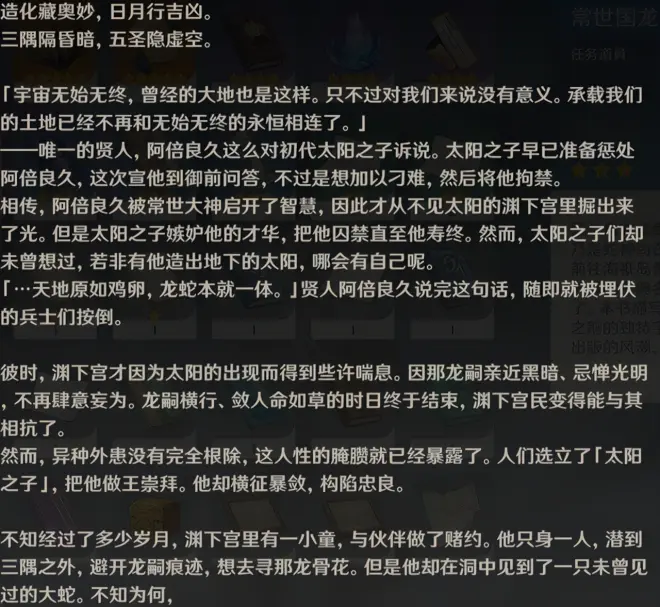 所以大家也可以认为这是“太阳之子”,利用强大的武力占据了阿倍良久的功劳。因为有太阳的出现,渊下宫的人民终于得到了喘息。但是如今的我们都知道,渊下宫底下的有“龙族”的,而龙喜阴忌惮光明,所以人民利用光的能力击退的龙族。