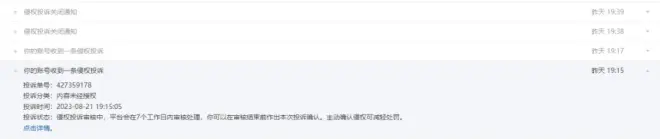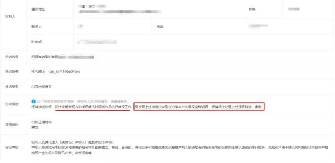 昨晚看到投诉权利人的时候我直接就把所有相关的内容都删了,各平台删(至于那些搬运抄袭的,也希望你们能删除),原因也很简单,我看到是第三方维权公司的投诉就悟了: