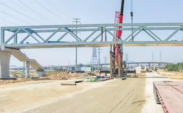 本次吊装任务所面临的是全钢结构的天桥,该天桥全长48.5米、宽3.9米、梁高4米、天桥梁底距路面5.5米,重量达到了100吨左右,为了确保吊装任务的安全顺利进行,技术人员先是对钢丝绳索具的质量强度进行了反复的检测,确保钢丝绳索具具备足够的强度之后方才投入使用,然后对大型起重吊机进行了试运行。