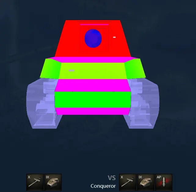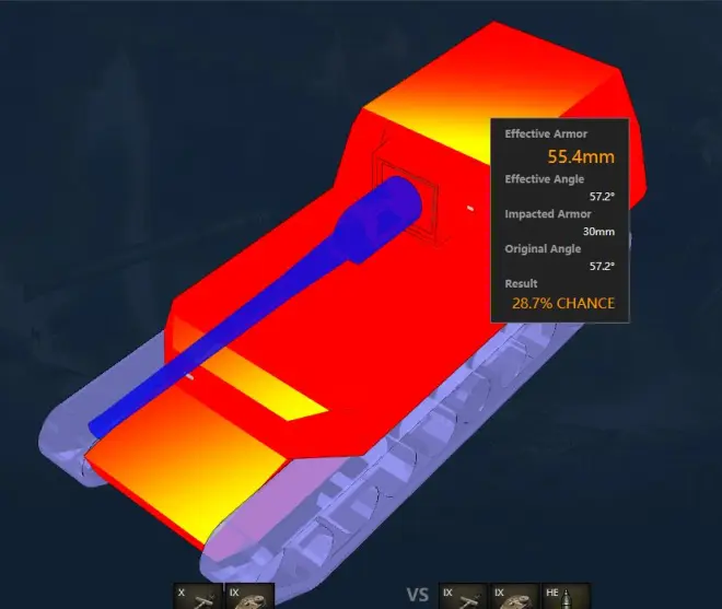 战斗室:垂直300mm正面,50mm侧面。350mm实心炮盾全包围,炮管60mm,炮根可靠。车顶30mm