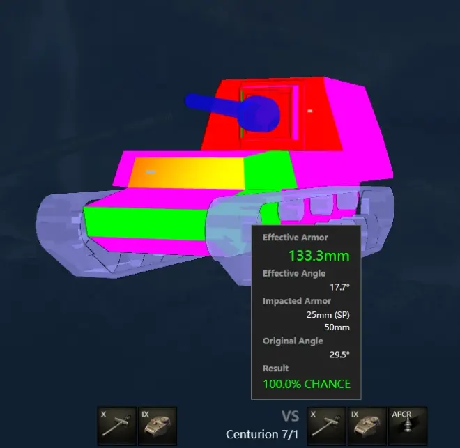 车体:首上等效246,首下等效120。小首下等效85,但是大部分矮车和口径小于150mm的打上去跳弹。车顶45mm。