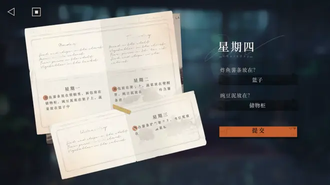 星期四,炸鱼薯条放在篮子,豌豆泥放在储物柜。