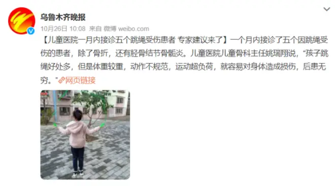 央视网就曾发微博提醒:错误的跳绳姿势,会对孩子的关节和脊柱造成损害,而且跳得越多,损坏越大。