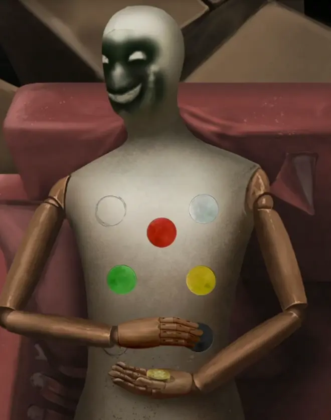 来到中间模特,把黄色和红色圆片都给安装上去,对应上面线索心火喜红、肝木怒绿、脾土忧黄、肺金悲白、肾水恐黑和图片,确定右上角的是肺(白色),中间是心(红色),左边中间是肝(绿色),右边中间是脾(黄色),因为没提到胃和大肠,所以右边下面是肾(黑色),调整完毕后小高能,模特手中拿到喜字滑块。