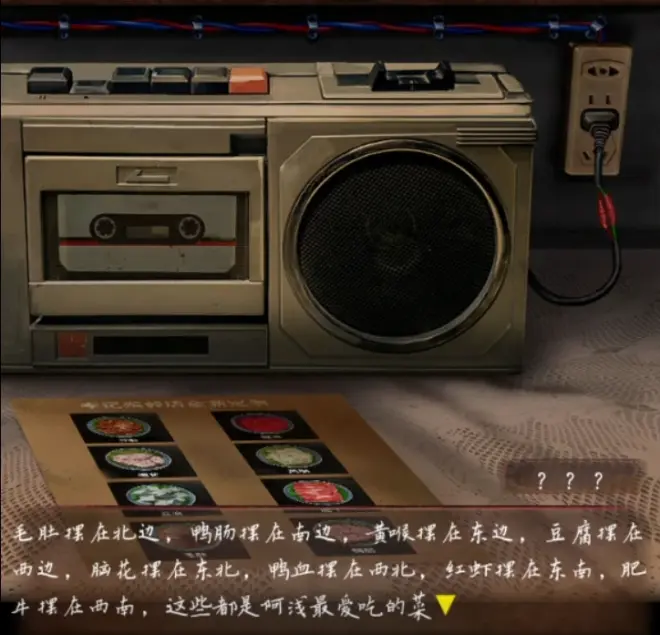 调查左边桌子上的录音机,先使用插头,然后用胶带缠起来插头和电线,最后放入录音带,线索很多记一下,画出来的话就是以鸭肠在南开始,顺时针为鸭肠-肥牛-豆腐-鸭血-牛肚-脑花-黄喉-红虾。