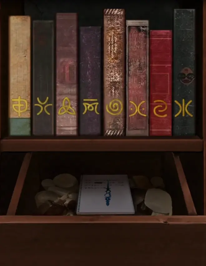 然后下楼找到书架,从右往左调整书本符号如下,调整完毕下面抽屉打开拿到表针,下面本子上也有线索记一下。